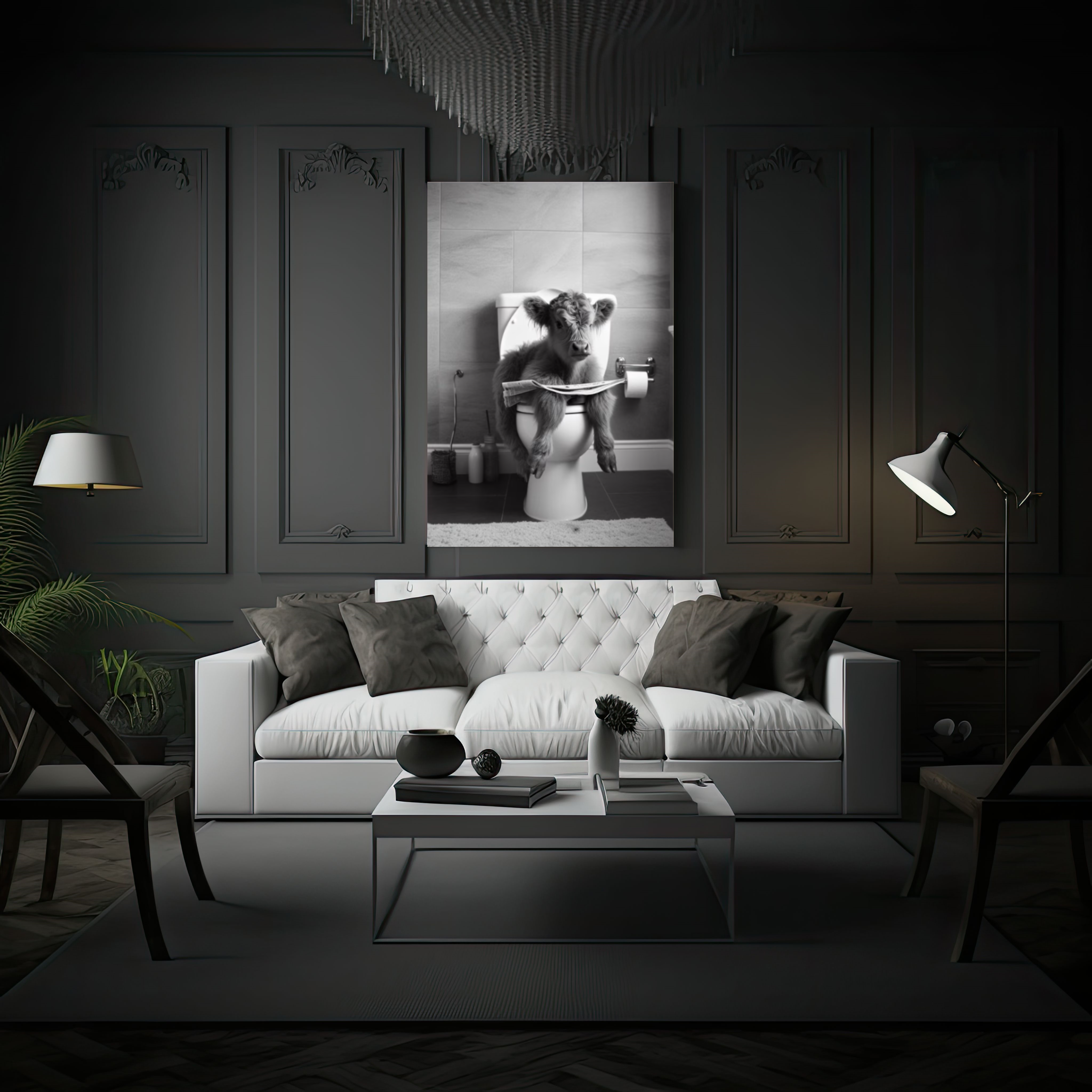 Introducing "Highland Scotland Cow Sitting On Toilet With Newspaper," a whimsical and humorous piece from our Humorous Collection that adds a playful touch to any space....