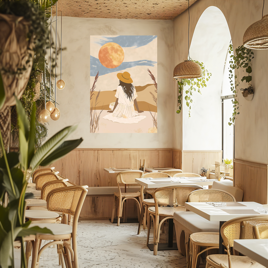 Serene boho landscape with sun"Add tranquility to your space with this serene boho landscape canvas print. Featuring a woman gazing at a warm, setting sun over rolling hills, this artwork... From Rs. 750.00From Rs. 750.00 Rs. 1,125.00/