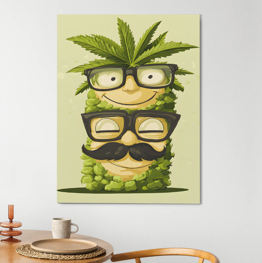 "high spirits" quirky cannabis character wall canvasAdd a spark of humor and personality to your space with "High Spirits", a playful wall canvas featuring a cartoon cannabis-themed character stacked with smiles, mustaches,... From Rs. 2,300.00From Rs. 2,300.00 Rs. 3,450.00/