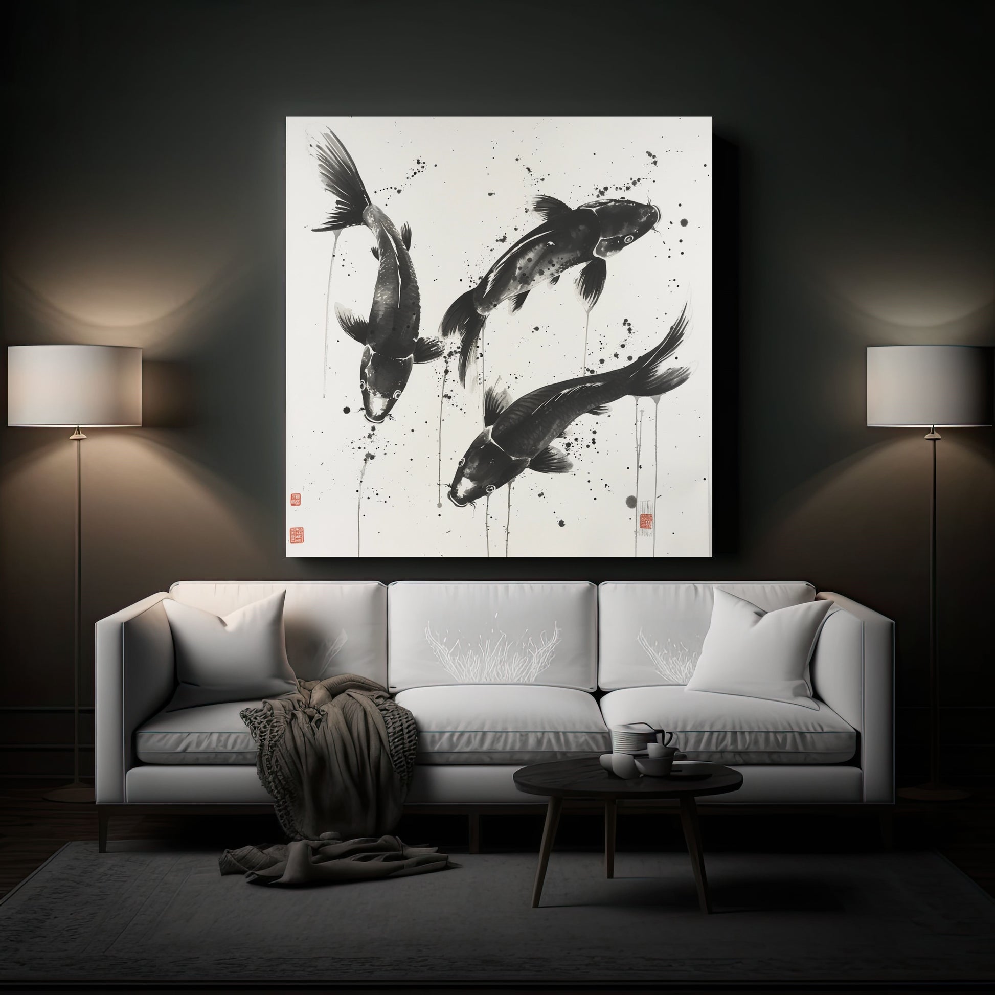 Dive into the simplicity and elegance if 'Trio of Serenity', a stunning black and white canvas art featuring three fishes swimming in harmony