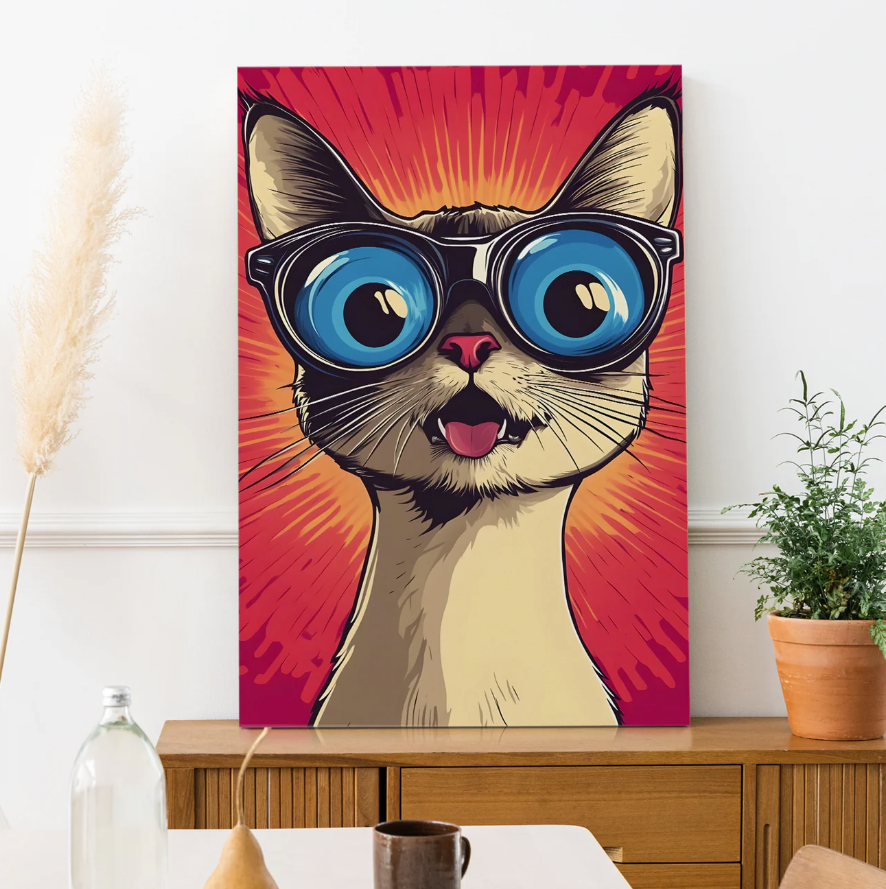 Add instant attitude and a splash of humor to your space with this Cool Cat Canvas, a high-energy pop art piece featuring a wide-eyed feline in oversized blue sunglasses. With vibrant red and orange bursts radiating behind the cat, this artwork combines comic book flair, bold color, and quirky character to create the ultimate statement piece.
