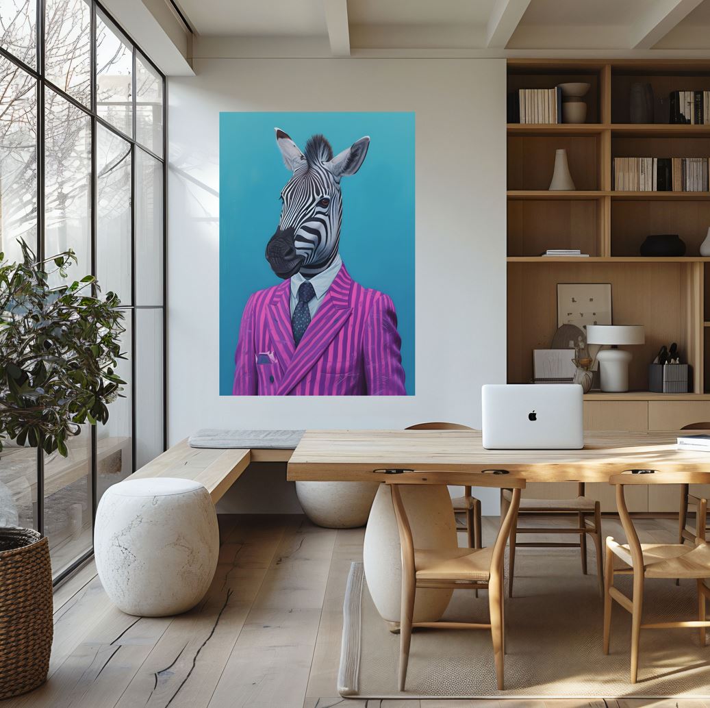 Add a touch of quirky elegance to your decor with this fashionable canvas print featuring a zebra dressed in a pink and purple striped suit. Perfect for creating a stylish and playful atmosphere, this unique artwork is sure to be a conversation starter in any room