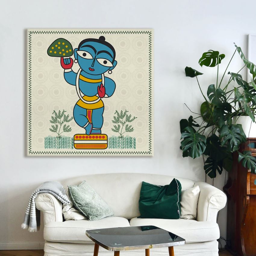 This Krishna Madhubani wall art showcases the historic Indian art style, featuring intricate and vibrant designs. Crafted with care, it adds a touch of culture and beauty to any room. Experience the ancient story of love and devotion with this elegant and unique piece.