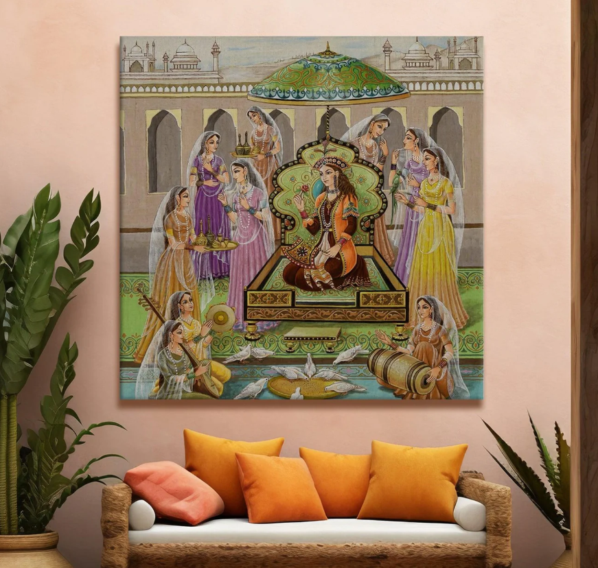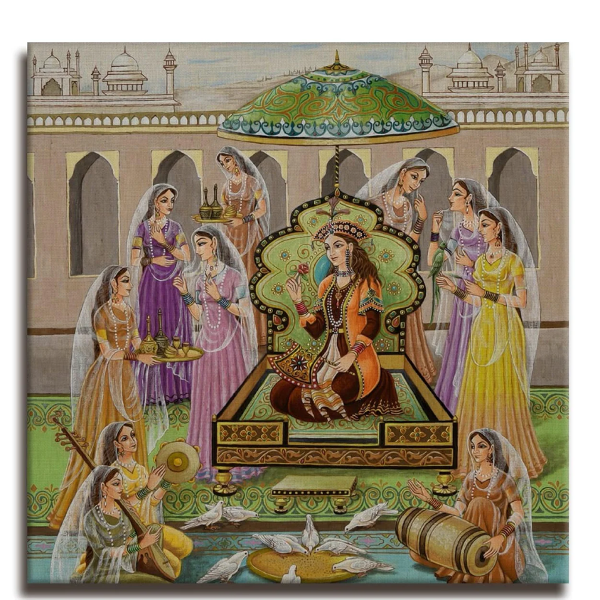 Experience the elegance and grace of the Mughal era with our Mughal Princess Wall Art. This modern artwork showcases a princess surrounded by her royalty and a stunning peacock in a lush garden setting. Perfect for adding a touch of royalty to any space.