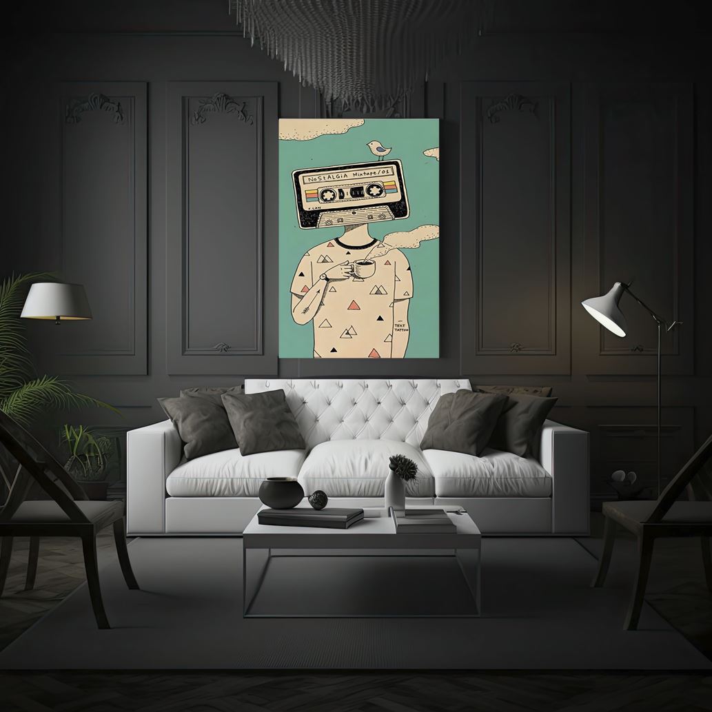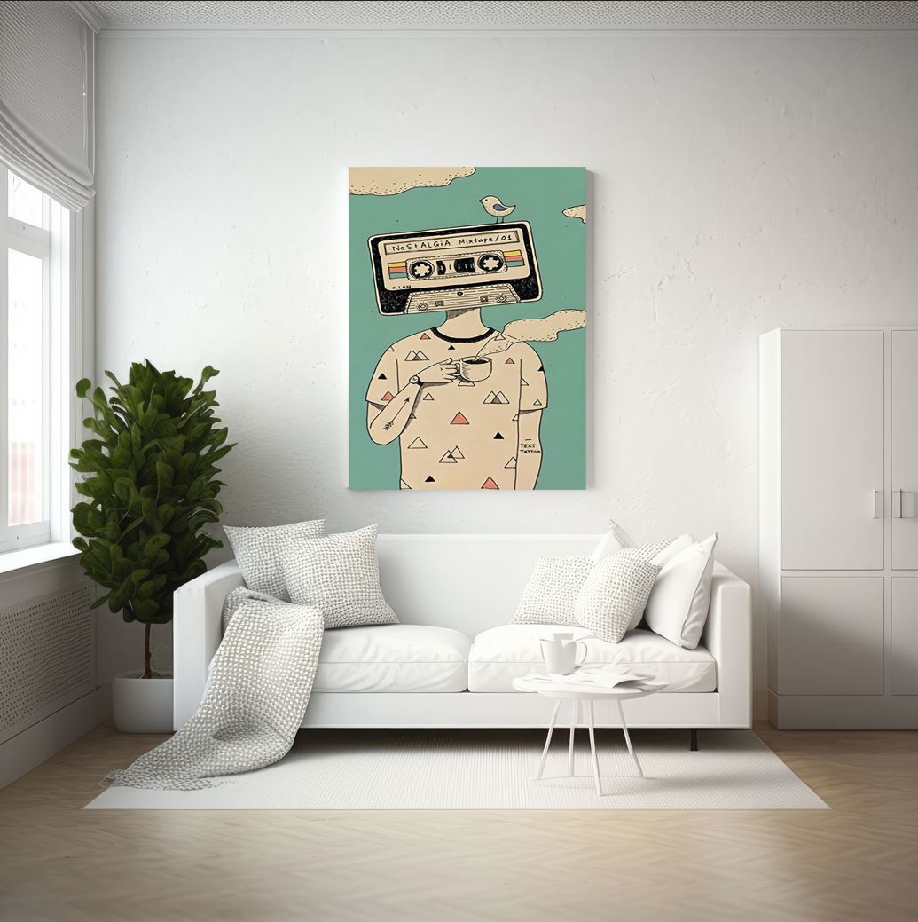 Bring a whimsical touch to your space with this nostalgic digital art canvas print. Featuring a quirky character with a mixtape for a head and a bird perched on top, this playful piece is perfect for music lovers and those who cherish retro vibes. Ideal for adding a unique and fun element to any room.