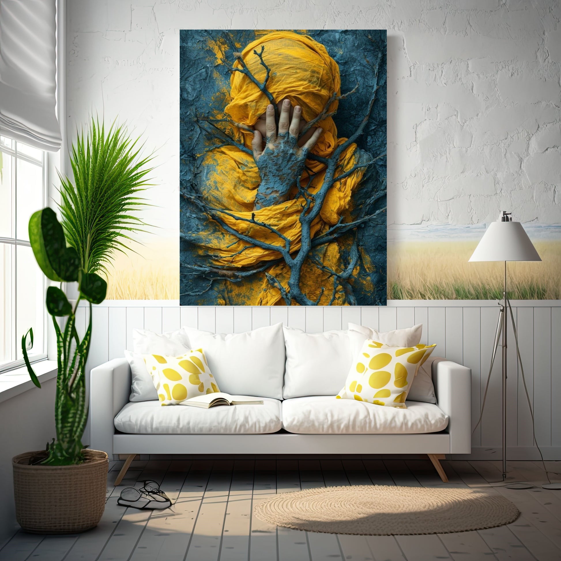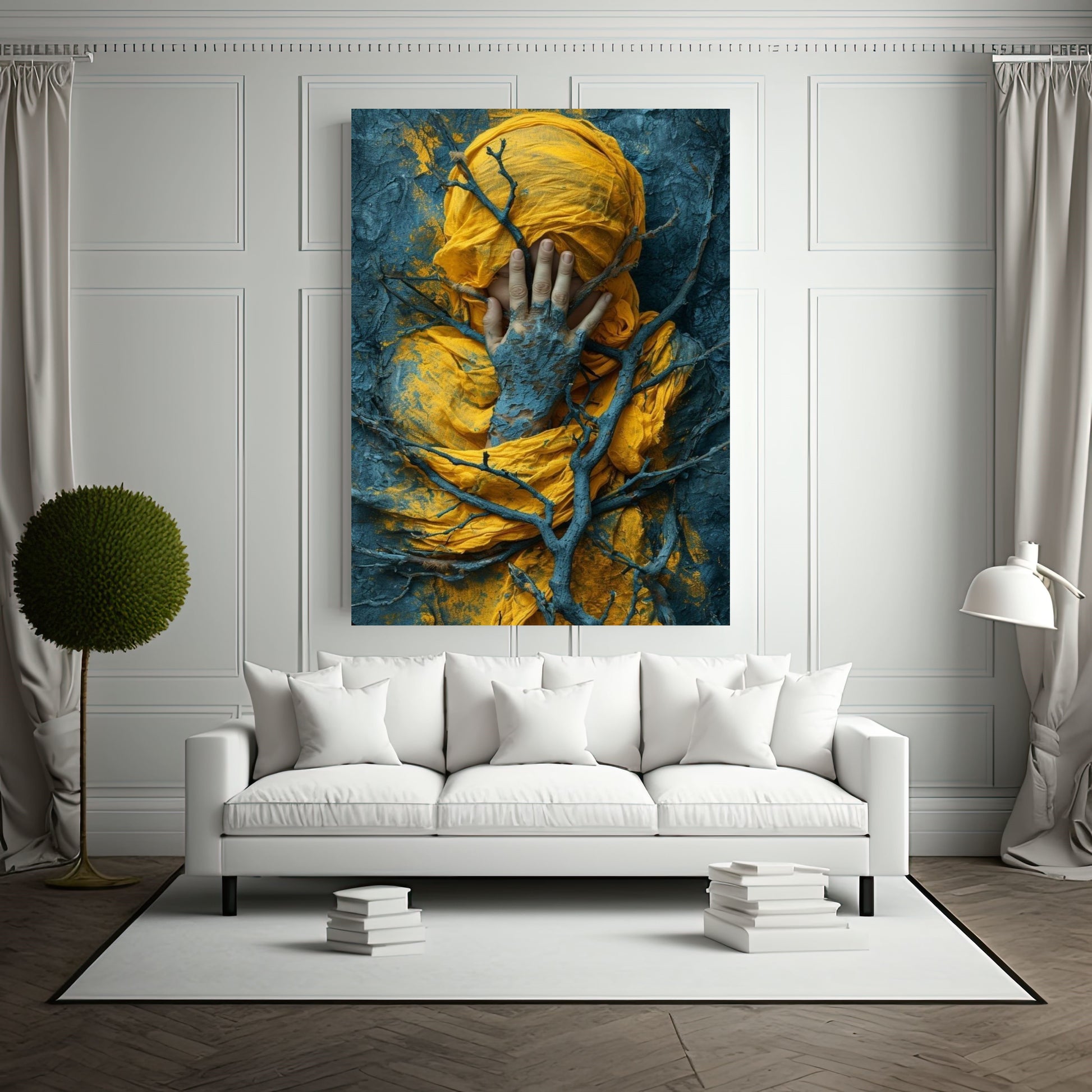 Where nature and soul intertwine. Rooted Silence is a striking visual metaphor of stillness, transformation, and inner reflection. Draped in vibrant saffron and embraced by textured branches, this canvas tells a story of grounding, surrender, and sacred quietude. A deeply symbolic piece for spaces that seek meaning beyond beauty.