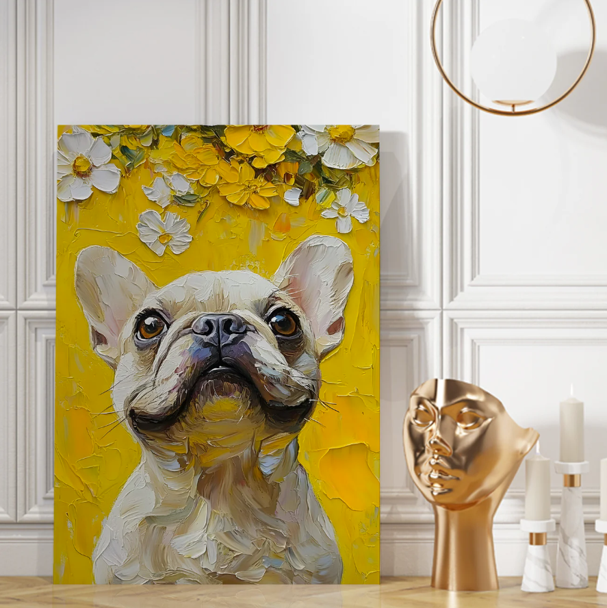Add a burst of sunshine and charm to your space with the Sunny Frenchie Canvas, featuring an irresistibly cute French Bulldog surrounded by golden florals on a cheerful yellow background. This textured art piece mimics palette knife brushstrokes, giving the pup and petals a lifelike, sculptural feel that pops with personality.